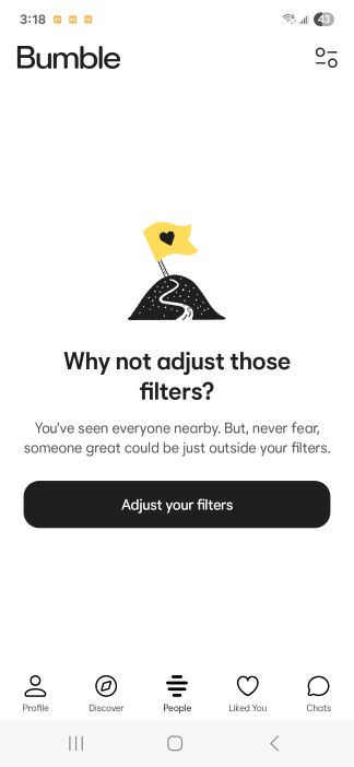 So I’ve reached the current level cap on Bumble. My filters include within 85 km and between 46 and 58. I’ve also checked to break these if no one else is around.